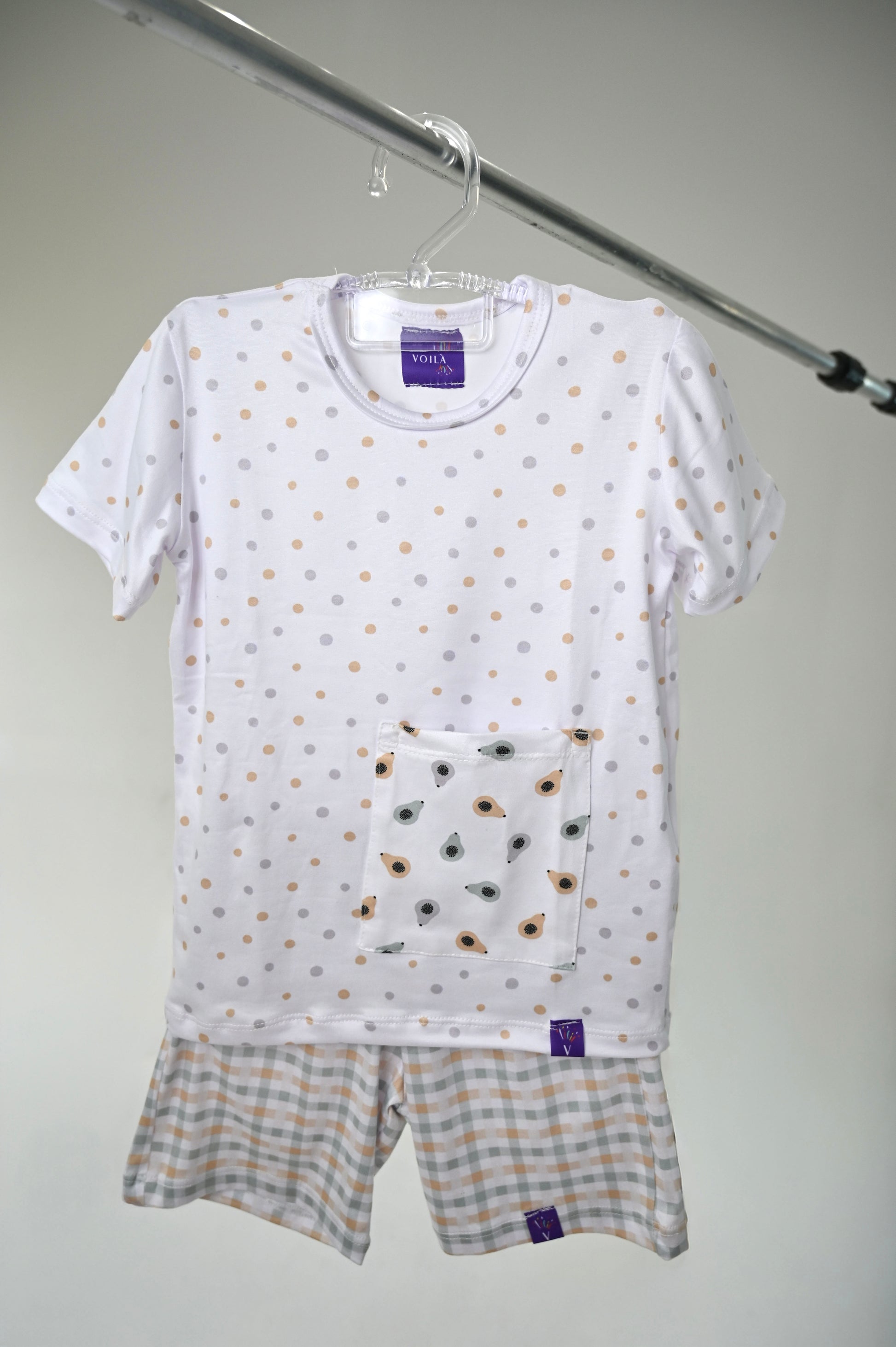 O Visual: Um verdadeiro manifesto de estilo. A bermuda xadrez em tons de menta e areia cria uma base clássica, que é quebrada de forma genial pela camiseta de fundo poá. O destaque absoluto é o bolso com a ilustração estilizada dos nossos papayas, trazendo o espírito divertido e descolado da Pop Art para o visual.