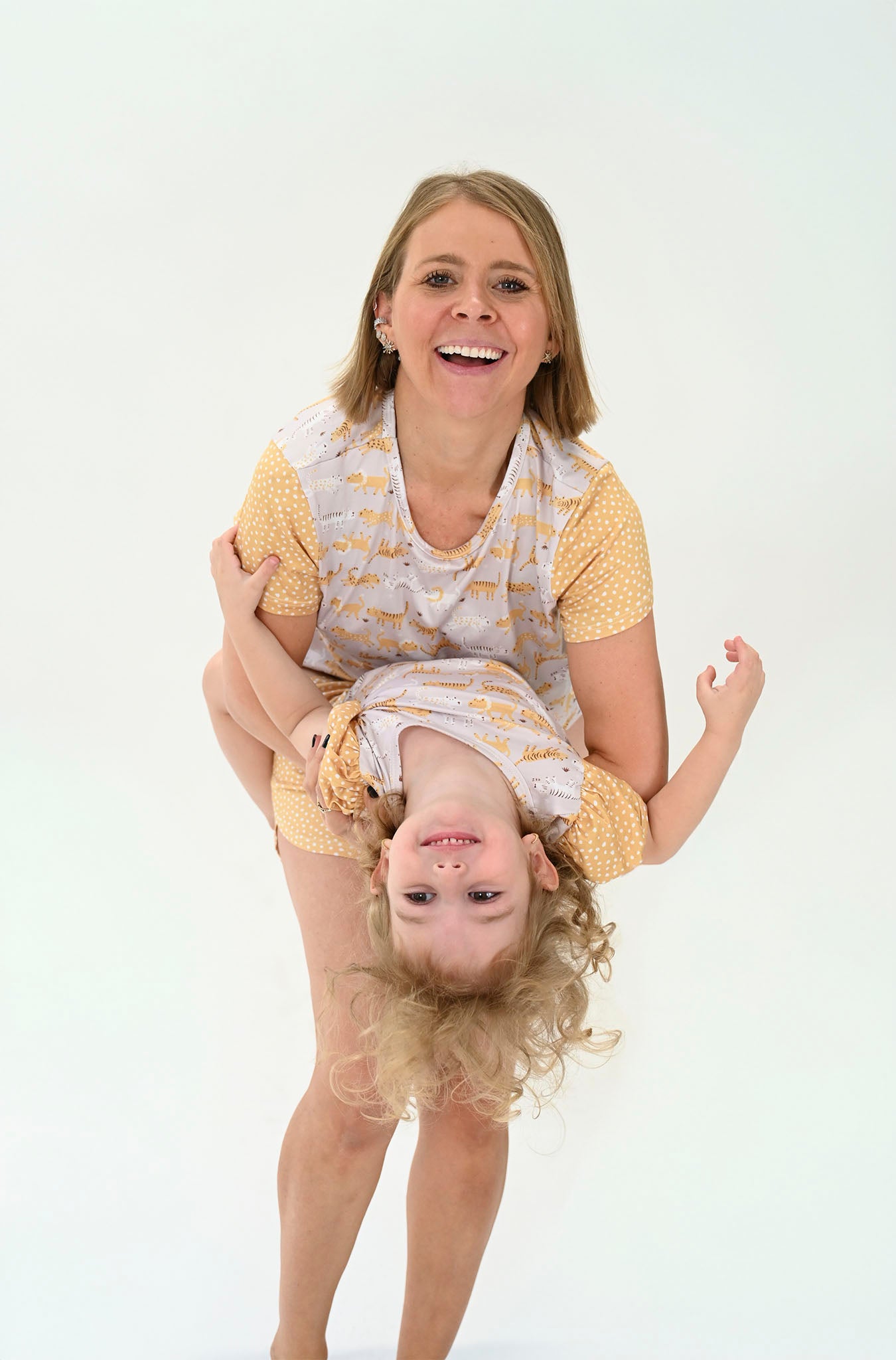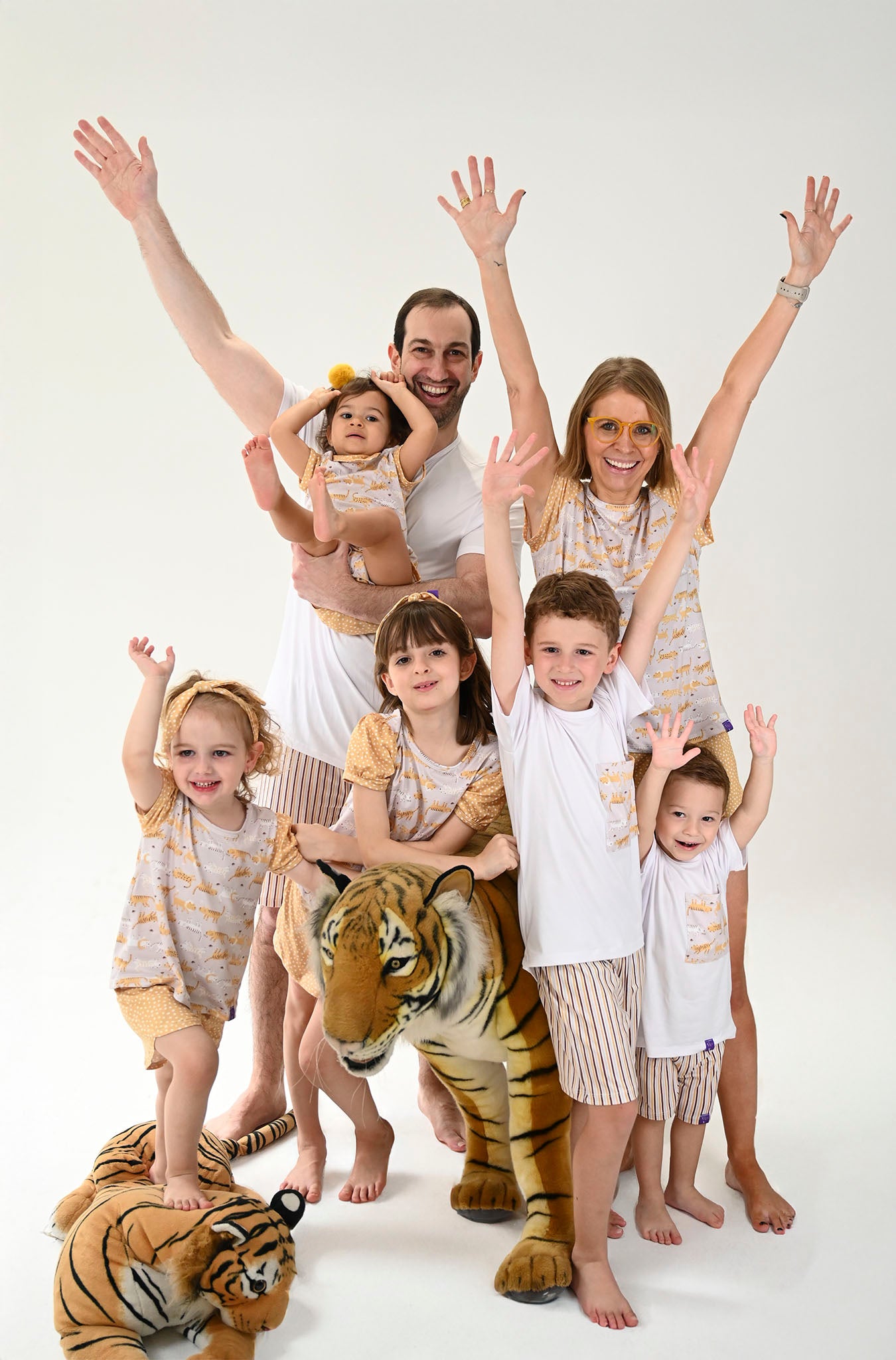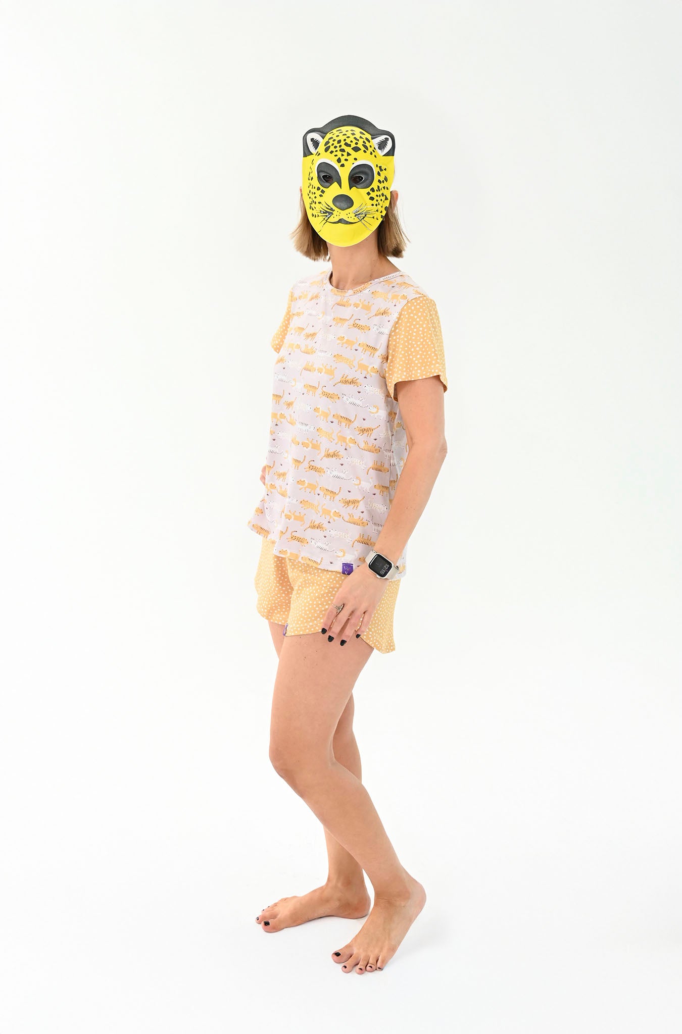O Visual: Versatilidade é poder. A T-shirt traz o impacto da nossa estampa full print de tigres e leões, mostrando quem manda. O short em petit poá mostarda completa o mix com um toque artístico. Diferente da versão infantil (Bela Fera), este modelo aposta em mangas retas e limpas, sem babados, garantindo um visual contemporâneo e descomplicado.