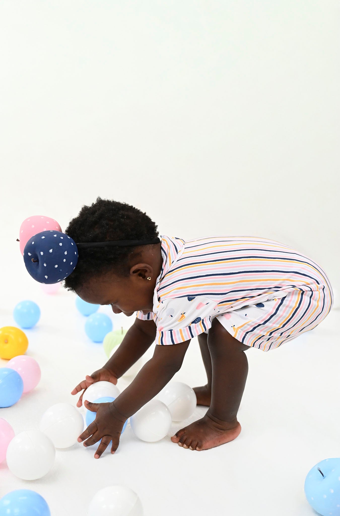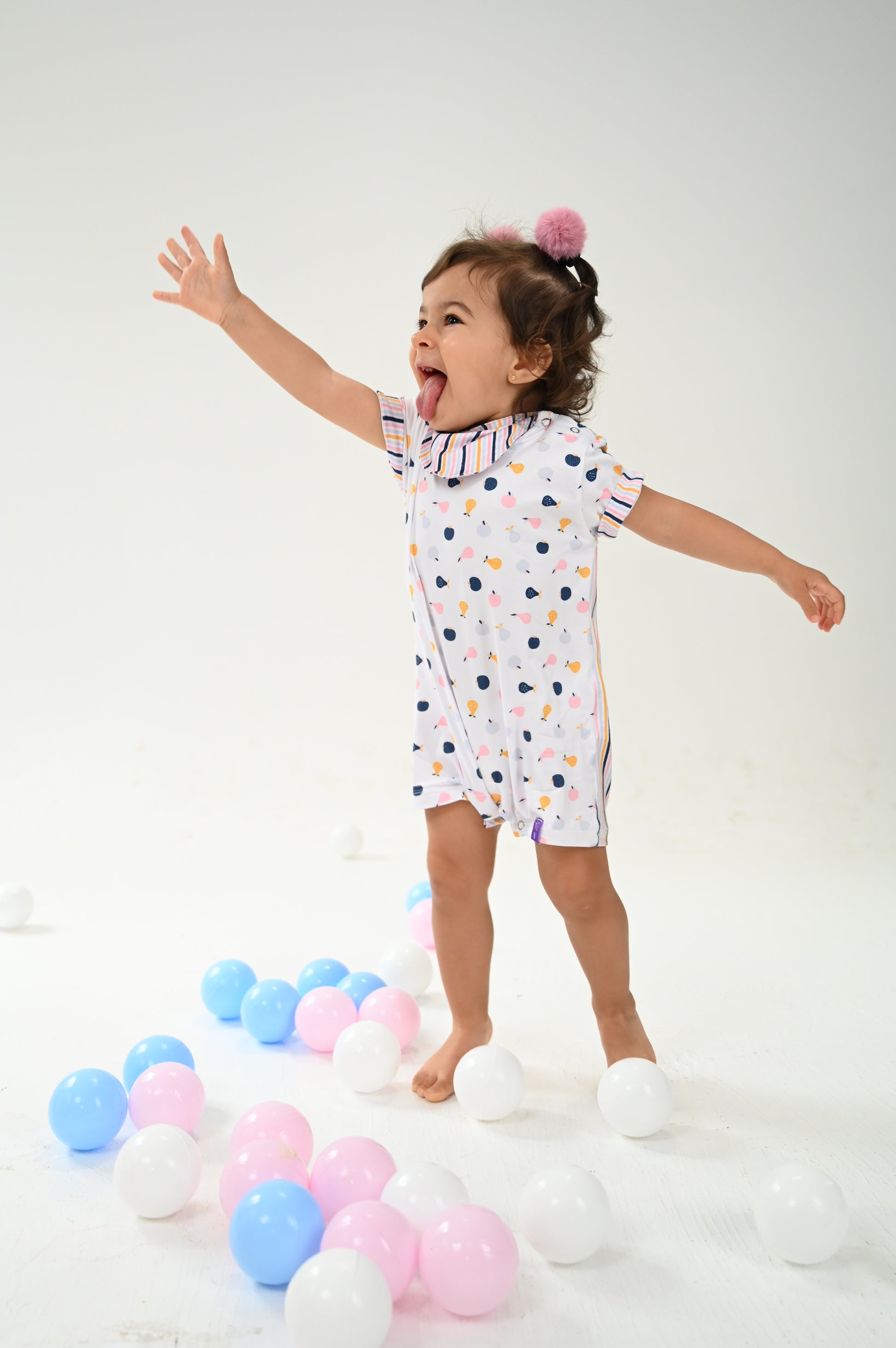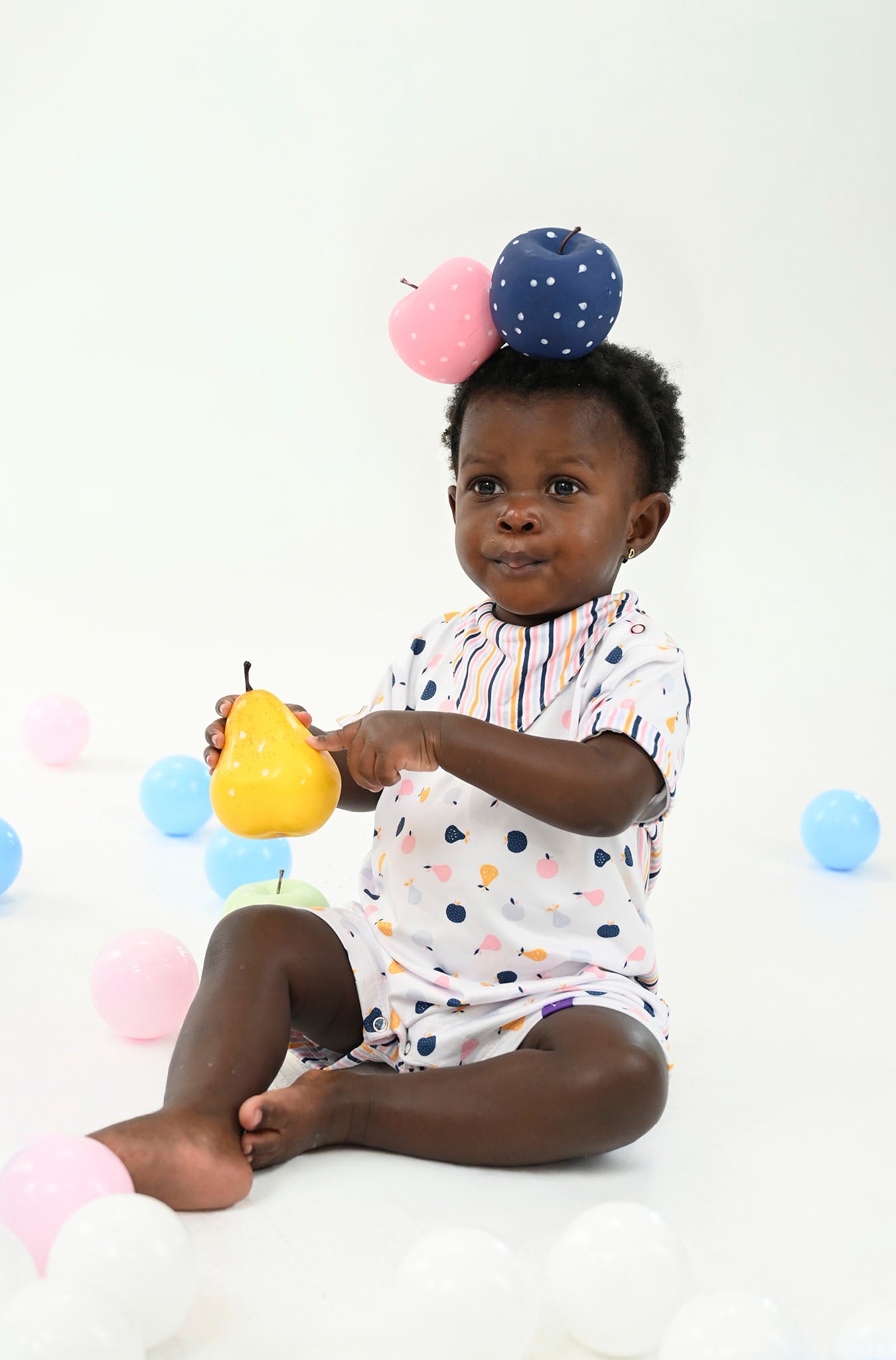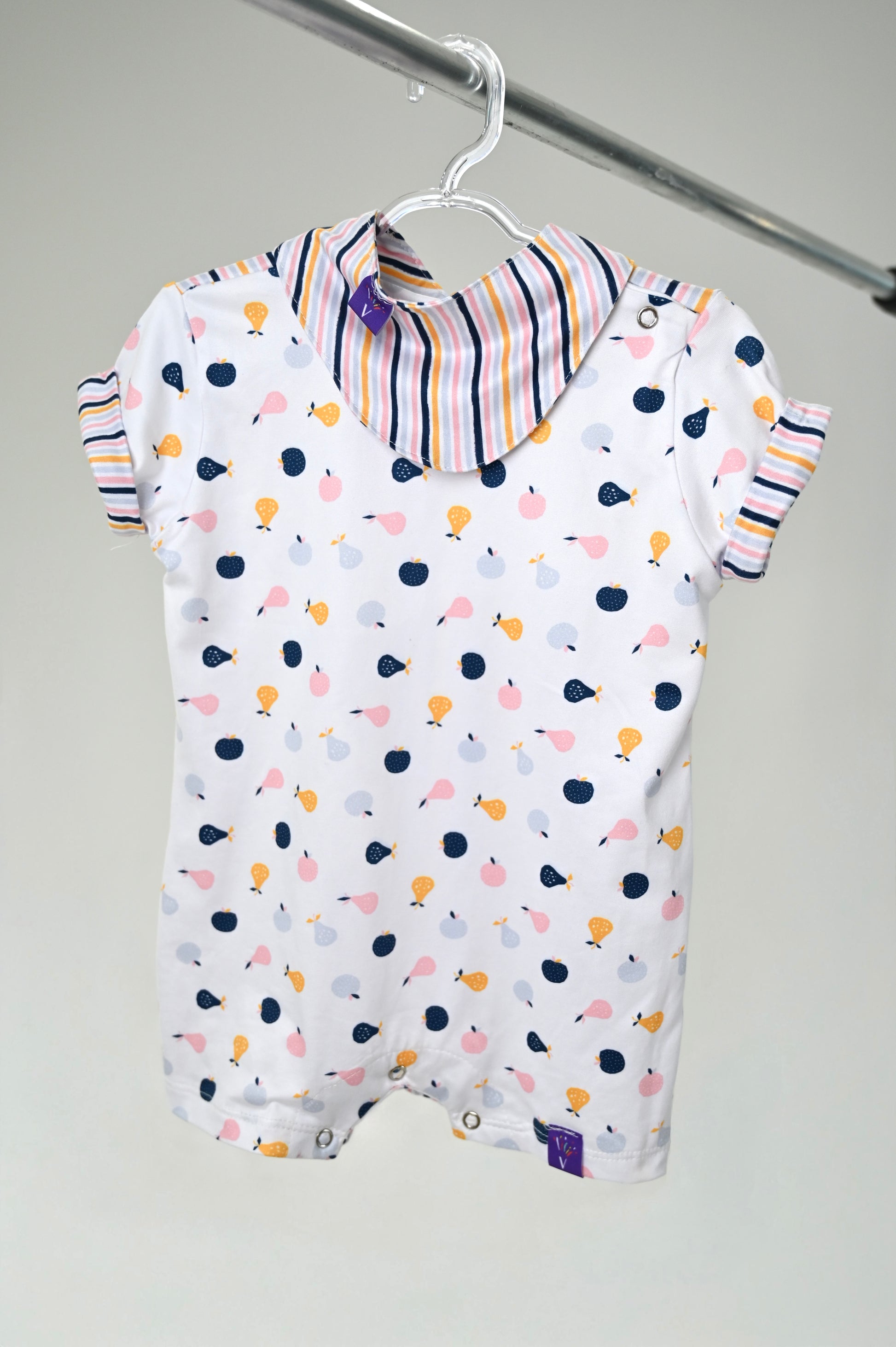 Descrição: Uma pequena obra-prima de conforto e fofura. O Tip Top Doce Arte une a temática lúdica das frutas com a essência artística da nossa coleção, criando o visual perfeito para os primeiros verões do bebé.
