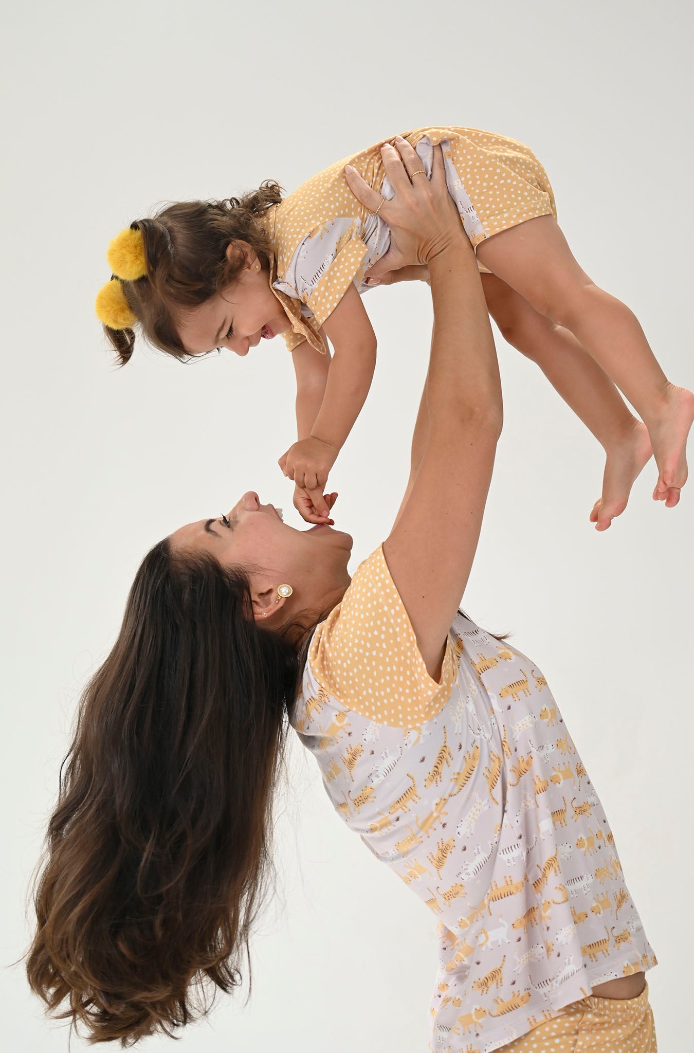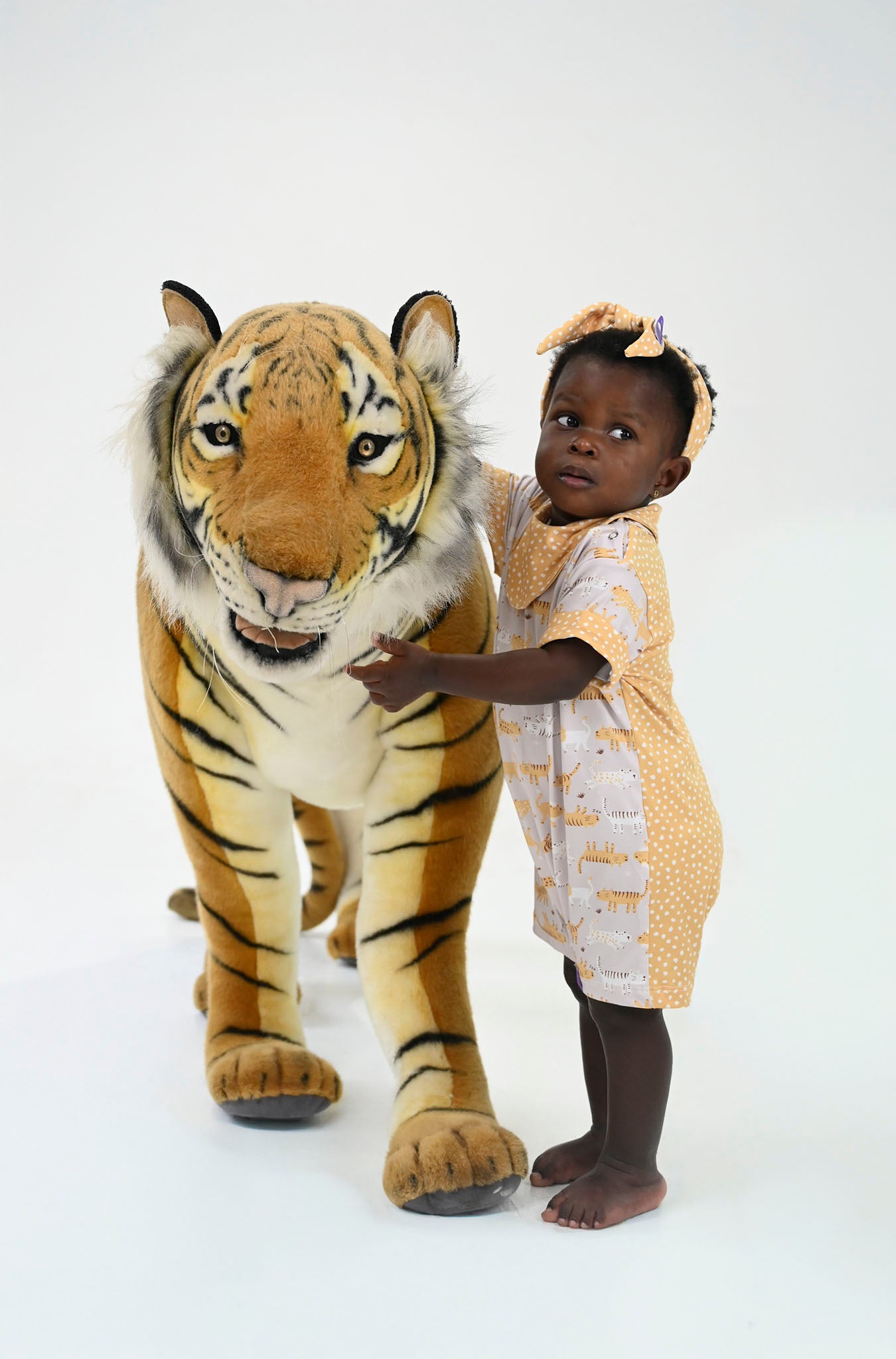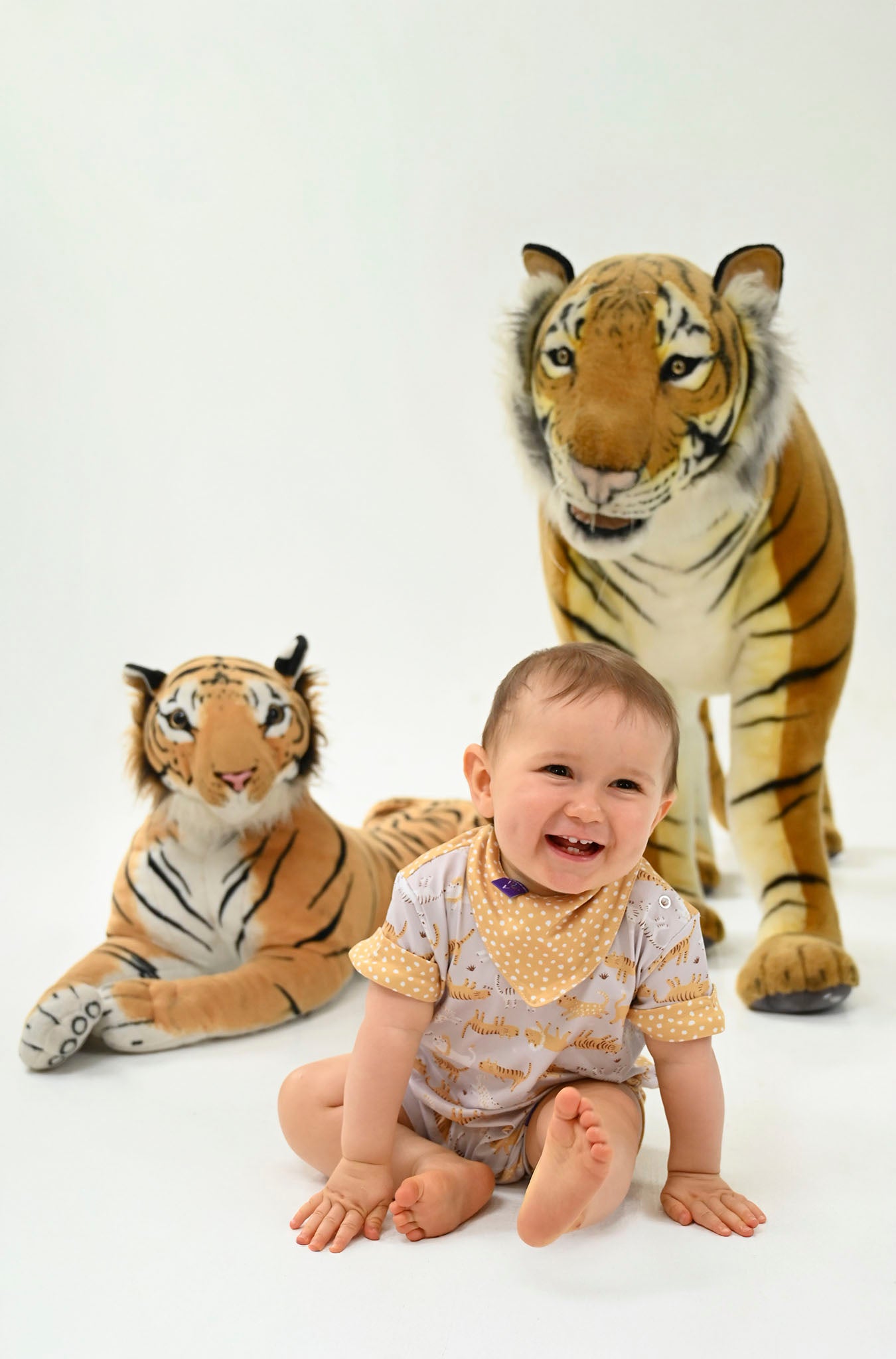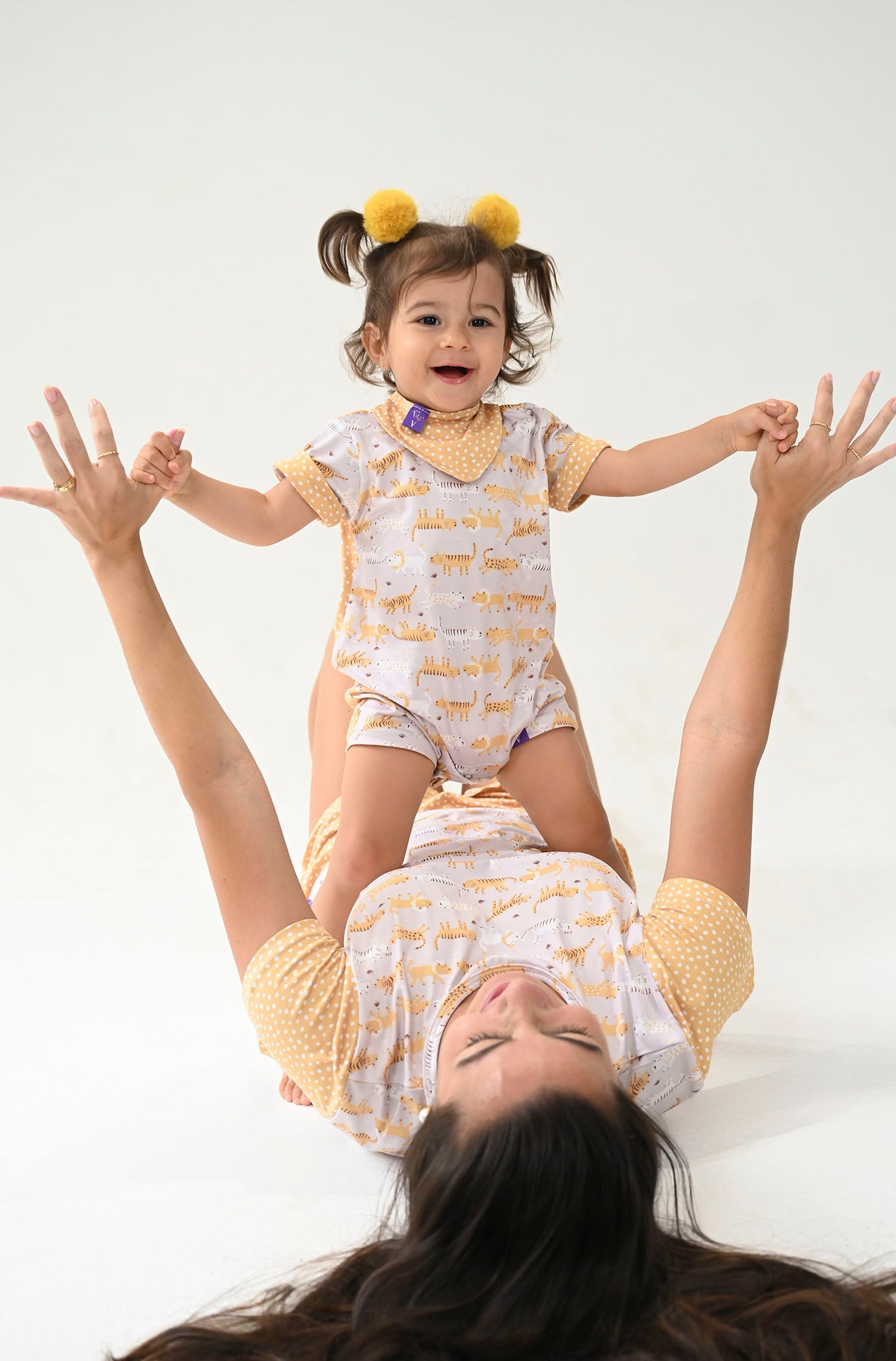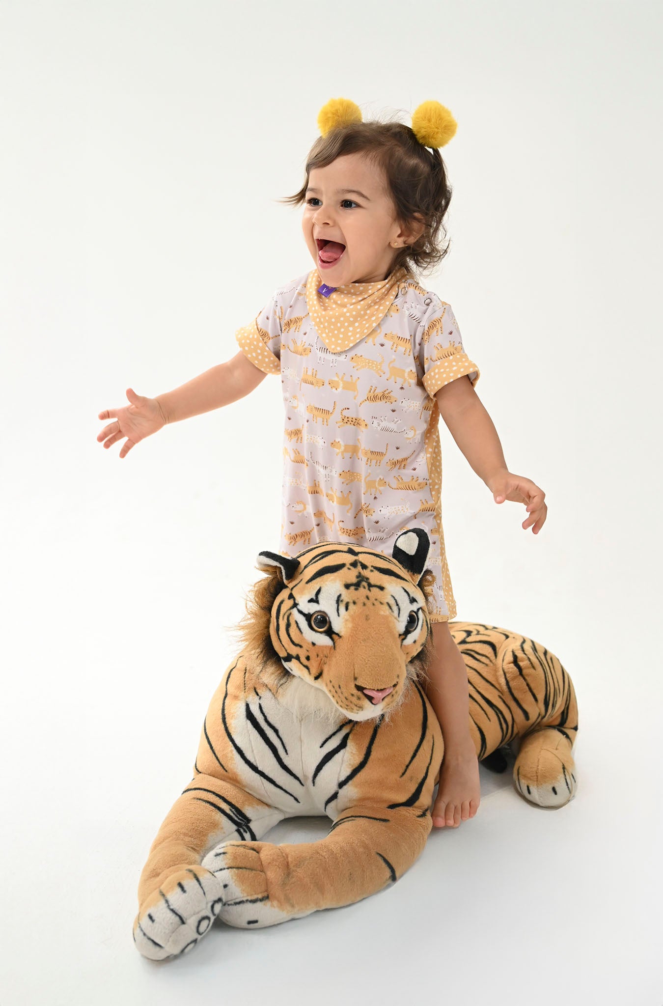 O Visual: Um design encantador que brinca com frente e verso. A parte frontal exibe a ilustração exclusiva dos nossos tigres e leões, enquanto as costas surpreendem com um petit poá artístico em tom mostarda, lembrando as pintinhas de um filhote. Um mix de estampas moderno e "instagramável".